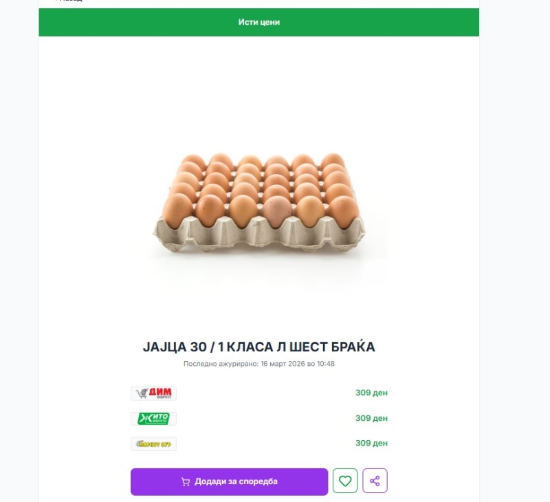На еден од сајтовите за споредба на цени во маркетите една табла јајца чини 309 денари а на 9 март чинела 279 денари