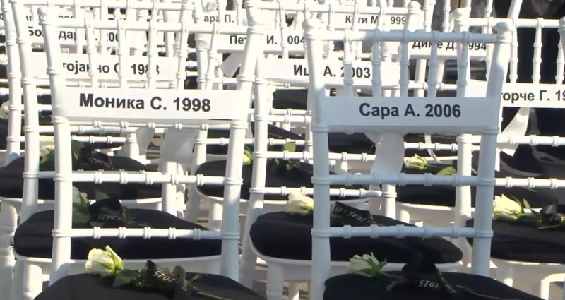 Шеесет и три бели столчиња, секое со по една бела роза и отворена книга на жалост, беа поставени во тишина како немо сведоштво за животи прекинати во најубавите години. Инсталацијата симболично ги претставува младите луѓе чии соништа и планови беа прекинати во трагедијата што длабоко ја потресе Македонија.