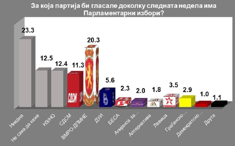 Од одговорите на испитаниците може да се заклучи дека речиси 50 отсто од граѓаните сѐ уште не одлучиле за кого ќе гласаат и одговориле со не знам, не сакам да кажам или нема да гласам. За ВМРО-ДПМНЕ би гласале 20,3 % од испитаниците, а за СДСМ 11,3%.