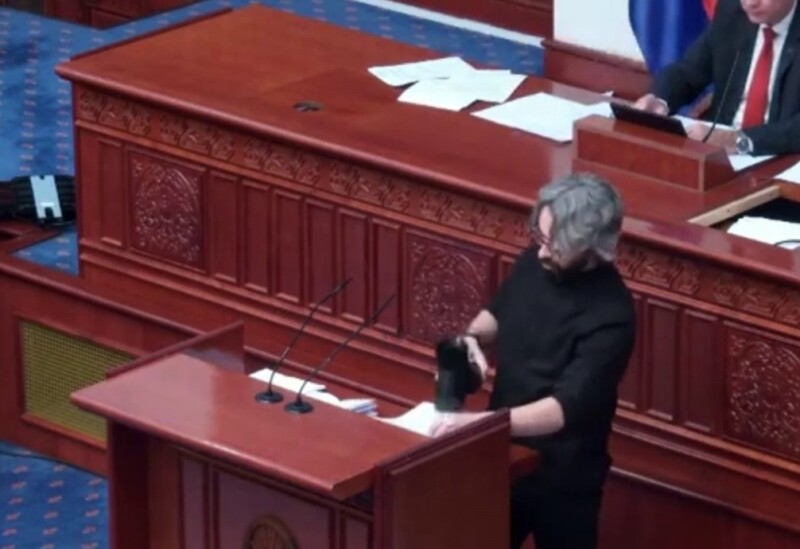 По паузата на говорница излезе пратеникот од „Левица“, Димитар Апасиев и со чевел им „удираше“ печат на амандманите за измени на Деловникот кои не беа прифатени со обрзоложение дека не биле заверени и само 12 од нив биле исправни.