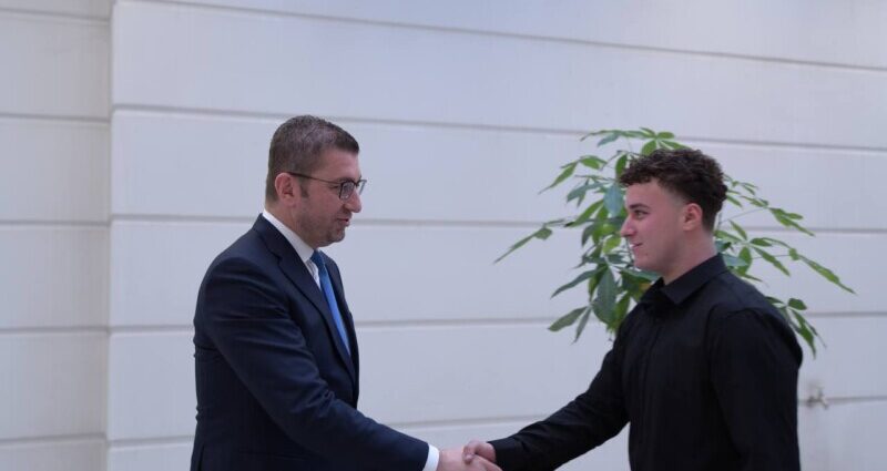 Премиерот Христијан Мицкоски денеска се сретна со младиот Јован Костадинов од Виница, кој спаси 21 лице од пожарот во дискотеката „Пулс“ во Кочани.
