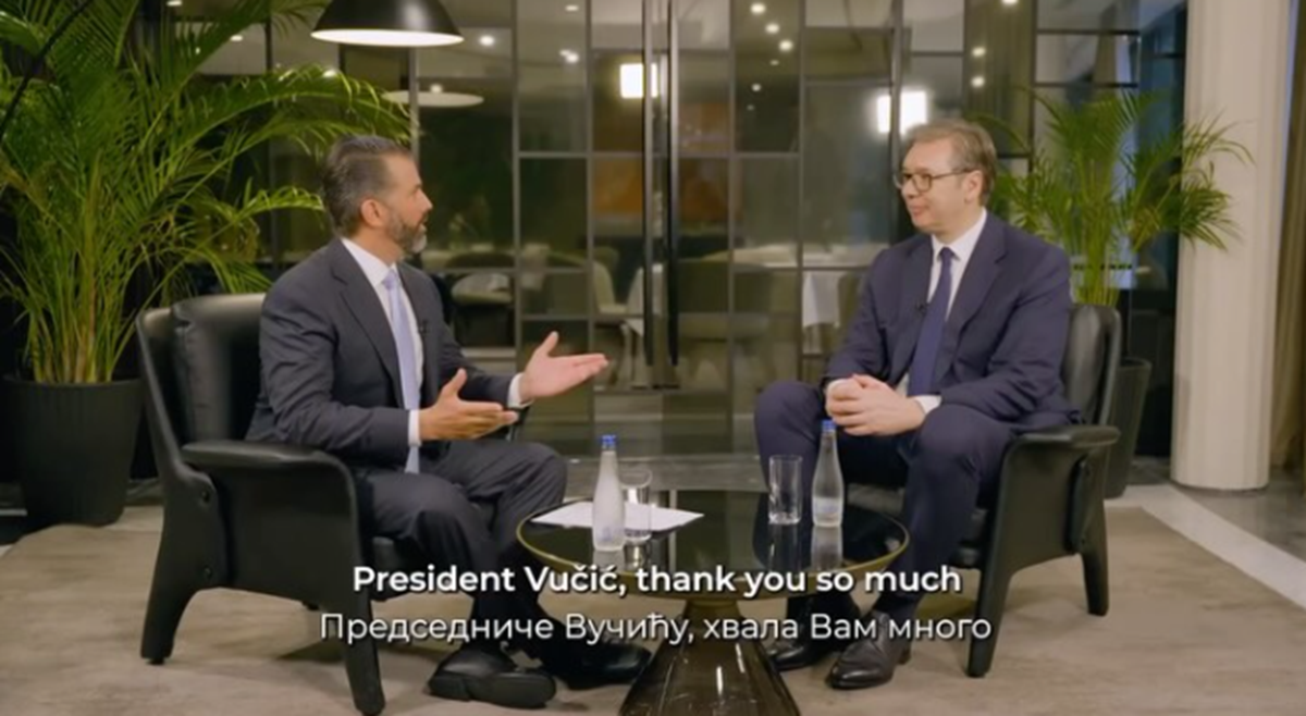 Српскиот претседател, Александар Вучиќ синоќа во интервју за поткастот на Доналд Трамп Јуниор изјавил дека Србија е земја која доживеала голем економски развој во последните години, држава со независен и суверен пристап кон меѓународната политика, но и земја која се соочува со протести и во која е во тек обид за обоена револуција со многу пари вложени од странство.